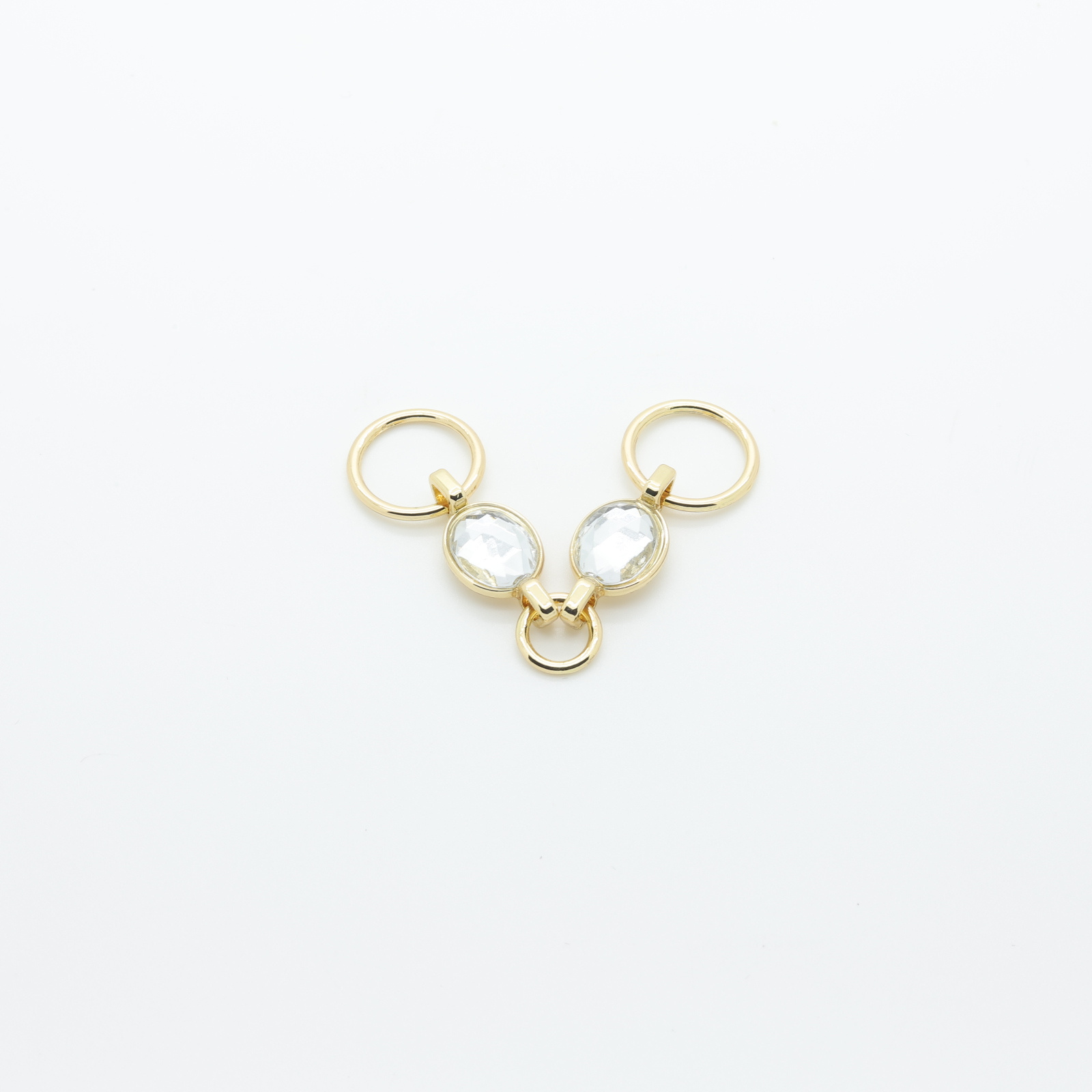 Elegant, refined chain in gold-plated metal with crystal for swimwear and lingerie, featuring two transparent crystals set in a shiny gold frame.
