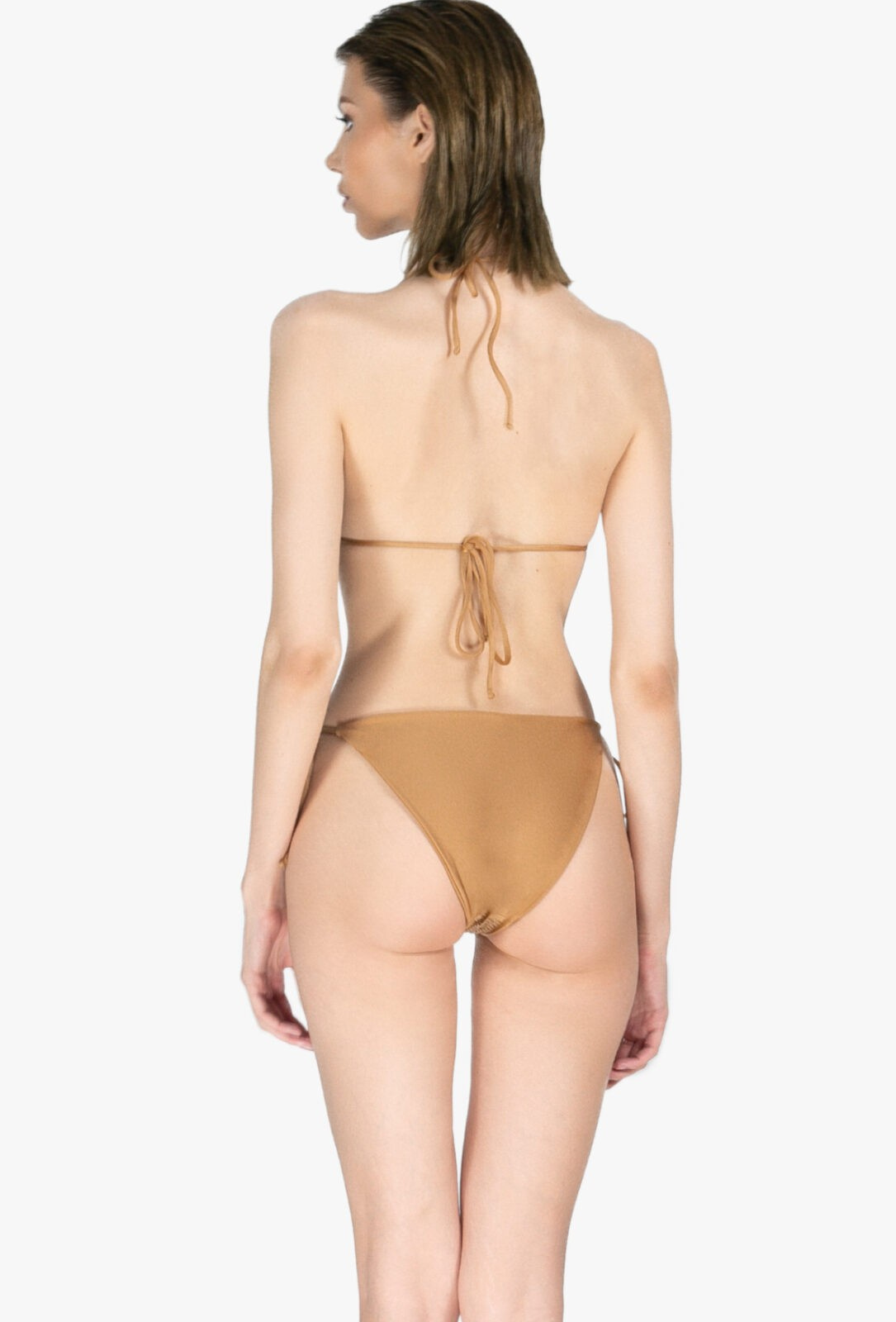 Adopta un tono cálido y terroso con este bikini triángulo café de pedrería. Los brillantes añaden un sutil destello, realzando su belleza.