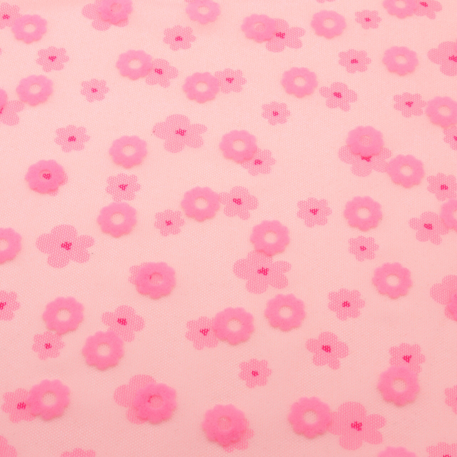 - Aspect : Résille transparente ornée de motifs floraux floqués roses