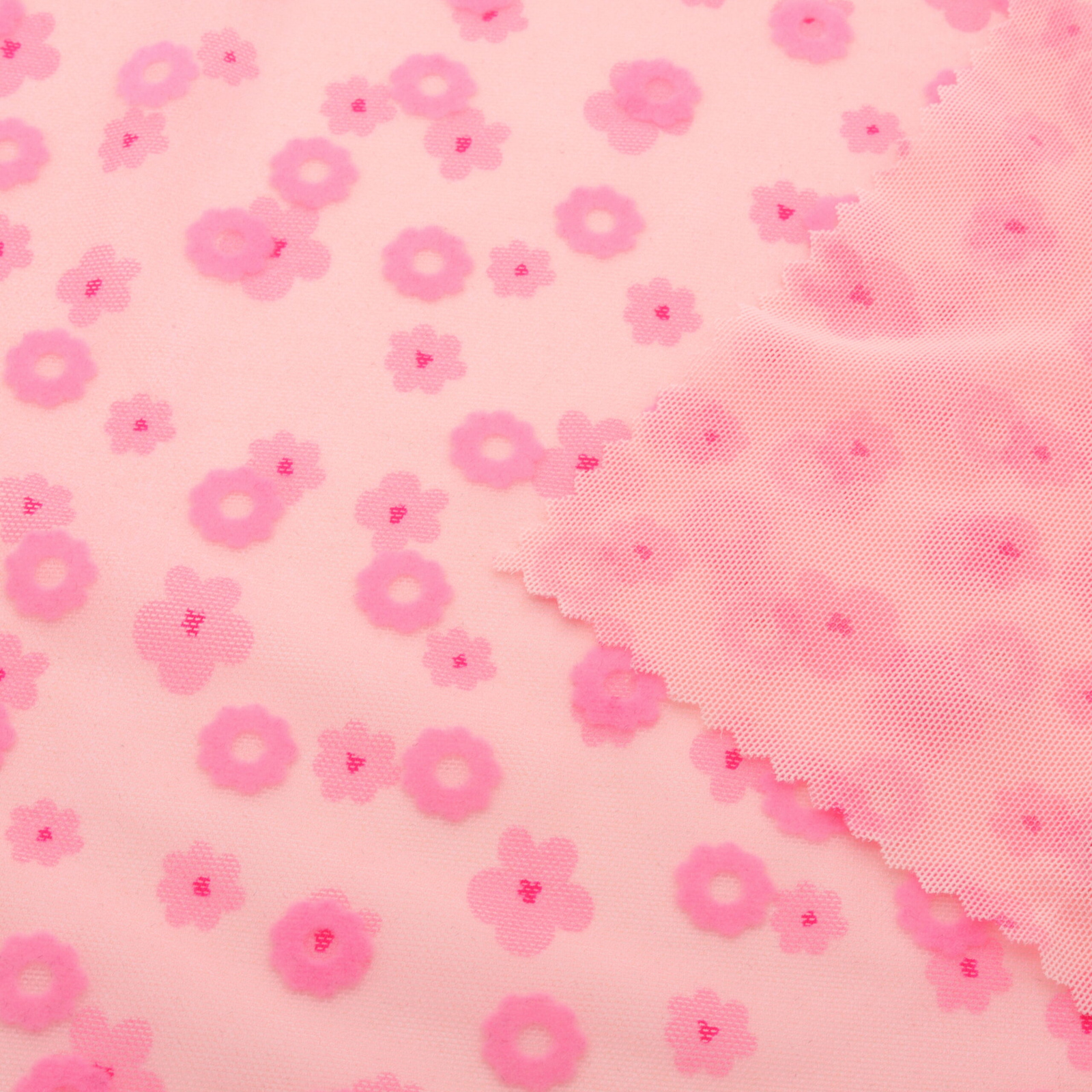 Tissu résille floquée fleurs rose recyclée extensible, léger et souple, idéal pour la lingerie, la mode féminine et les détails décoratifs. Sa base en nylon recyclé et élasthanne offre élasticité, confort et résistance tout en valorisant une démarche écoresponsable.
