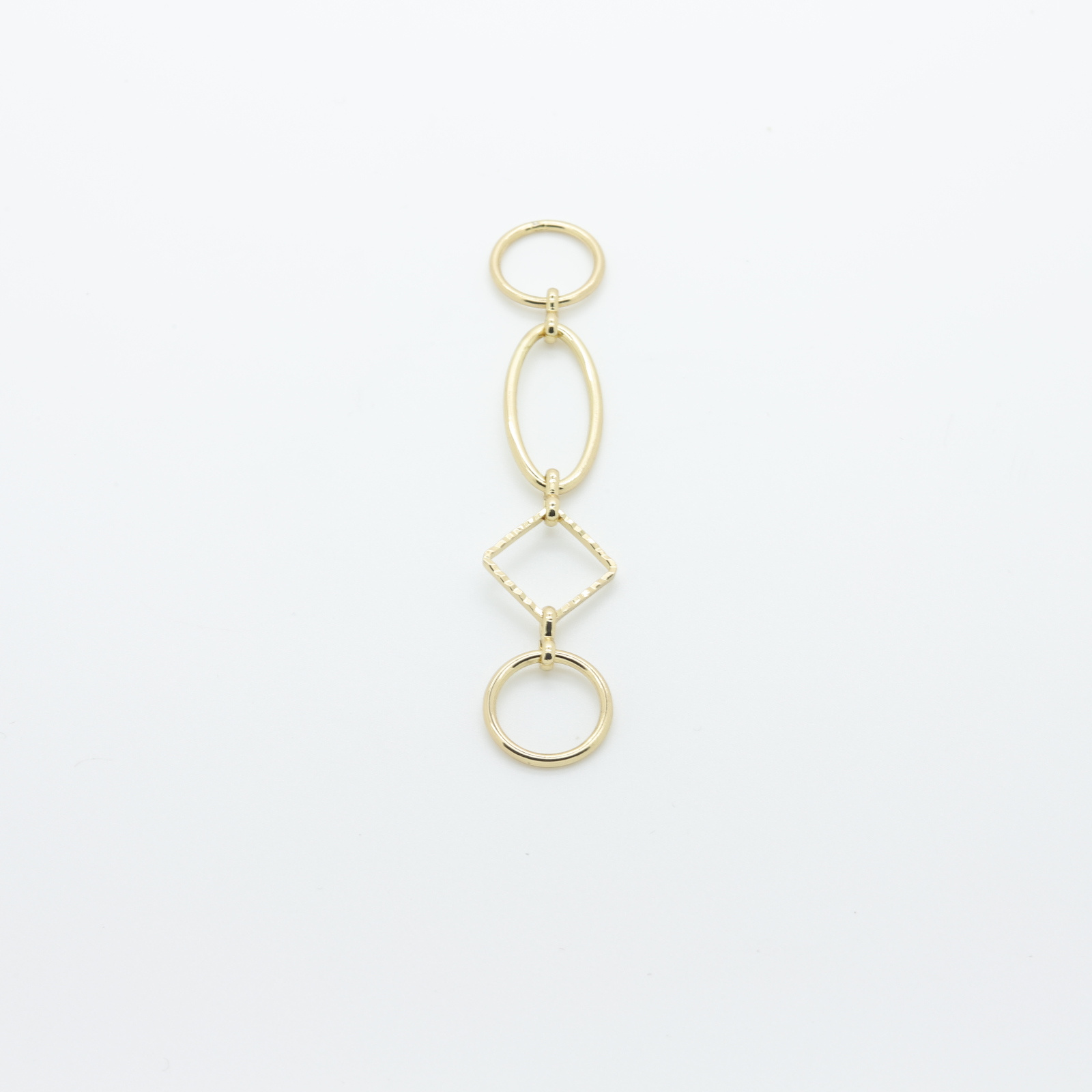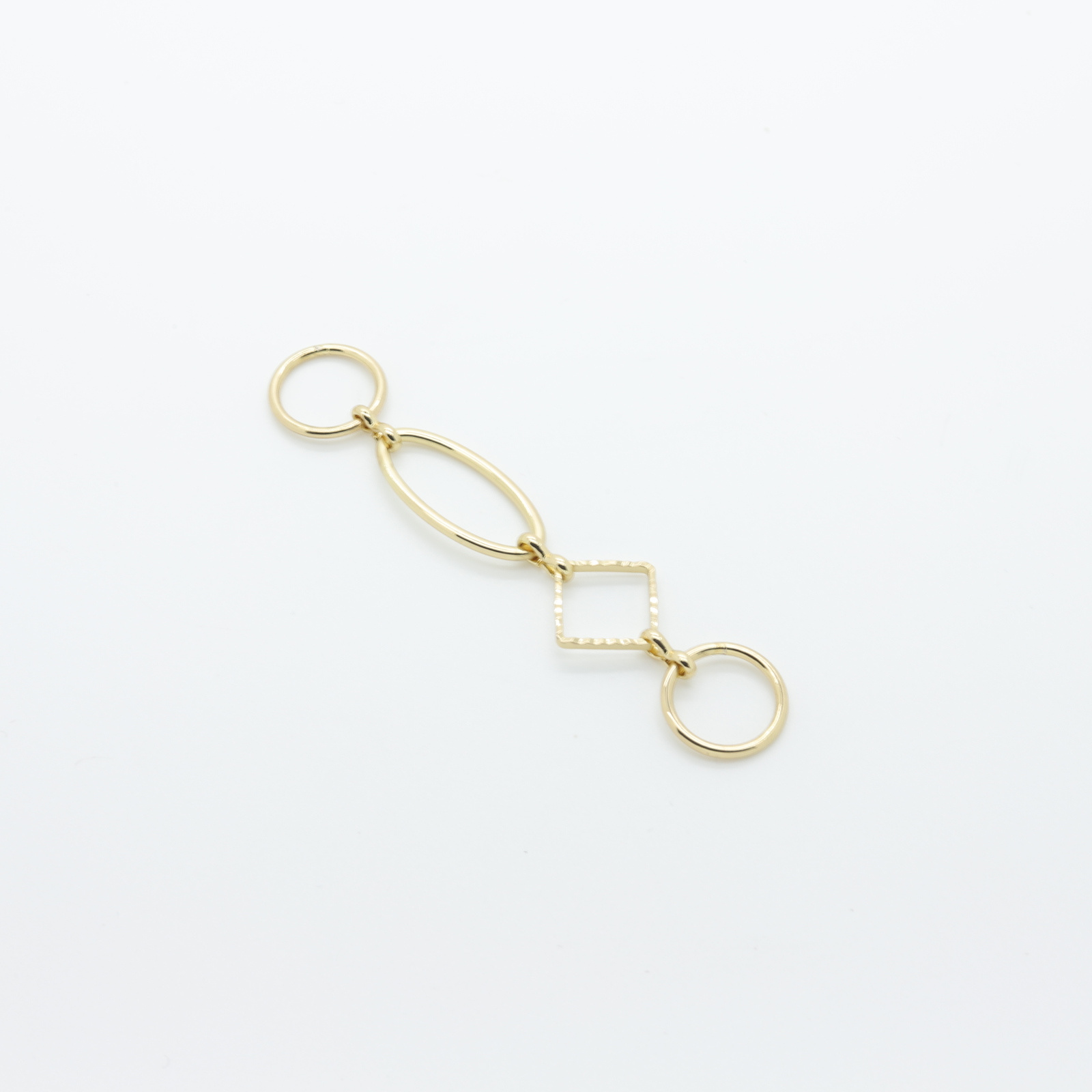 Corrente em metal dourado para lingerie e fatos de banho, elegante e requintada, com elos geométricos finamente trabalhados. Leve e resistente, confere um acabamento precioso e duradouro às criações de lingerie e fatos de banho.