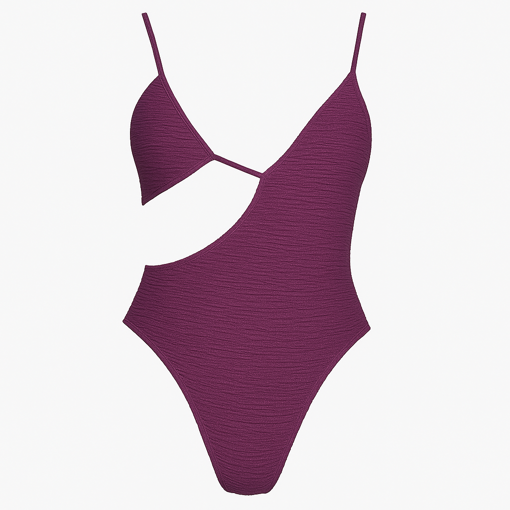 Tecido roxo de poliéster elastano em relevo para fatos de banho, com 155 cm de largura e 235 g/m² de peso. A sua textura delicadamente ondulada confere um acabamento requintado e elástico, ideal para fatos de banho e fatos de banho ajustados.
