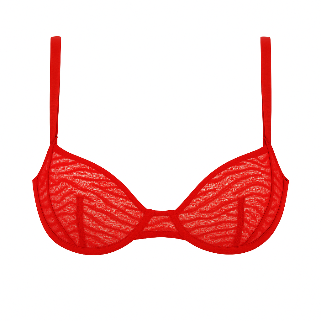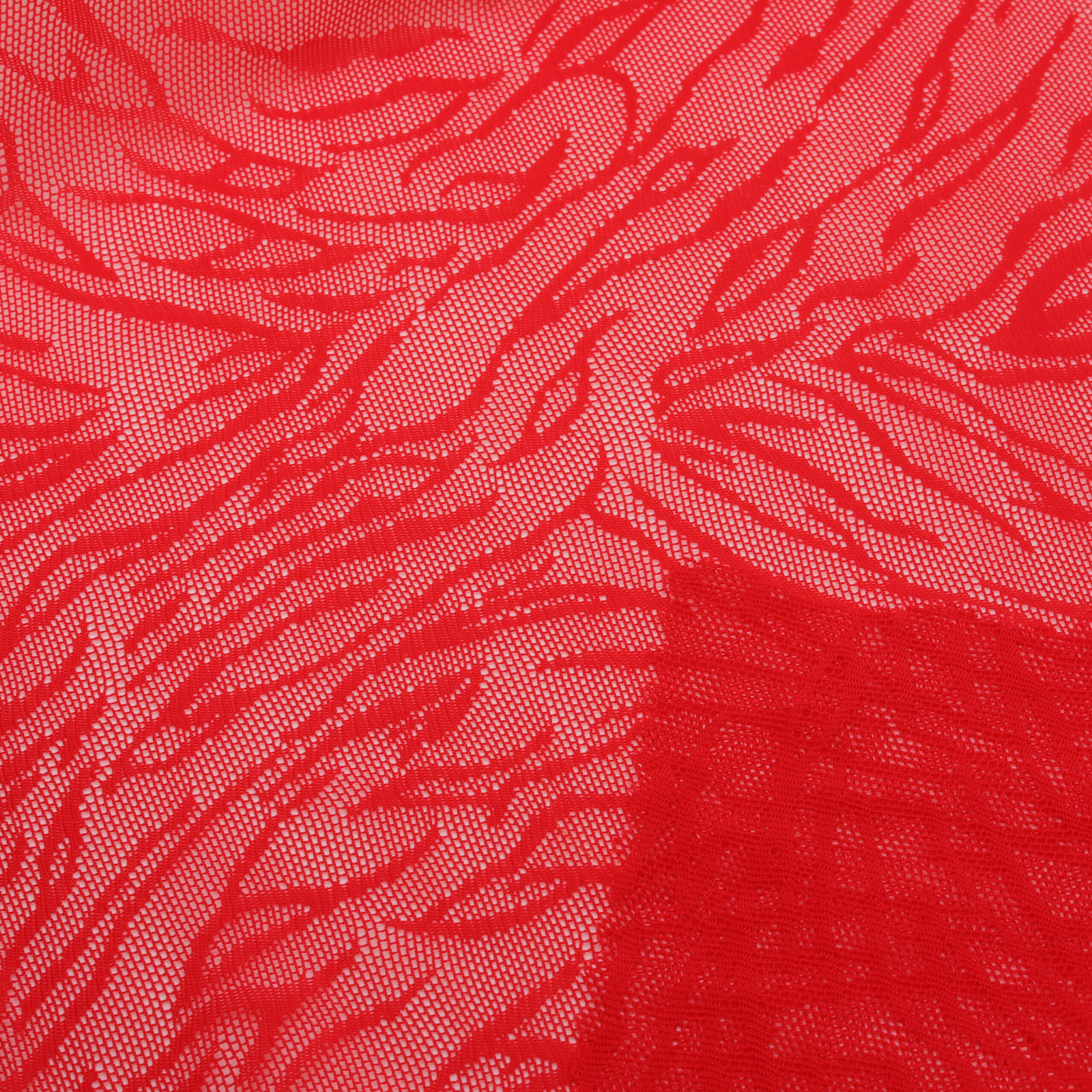 Tecido jacquard vermelho com elastano e nylon, leve e elástico, ideal para lingerie, roupa de dança ou criações de moda que exijam transparência e flexibilidade.