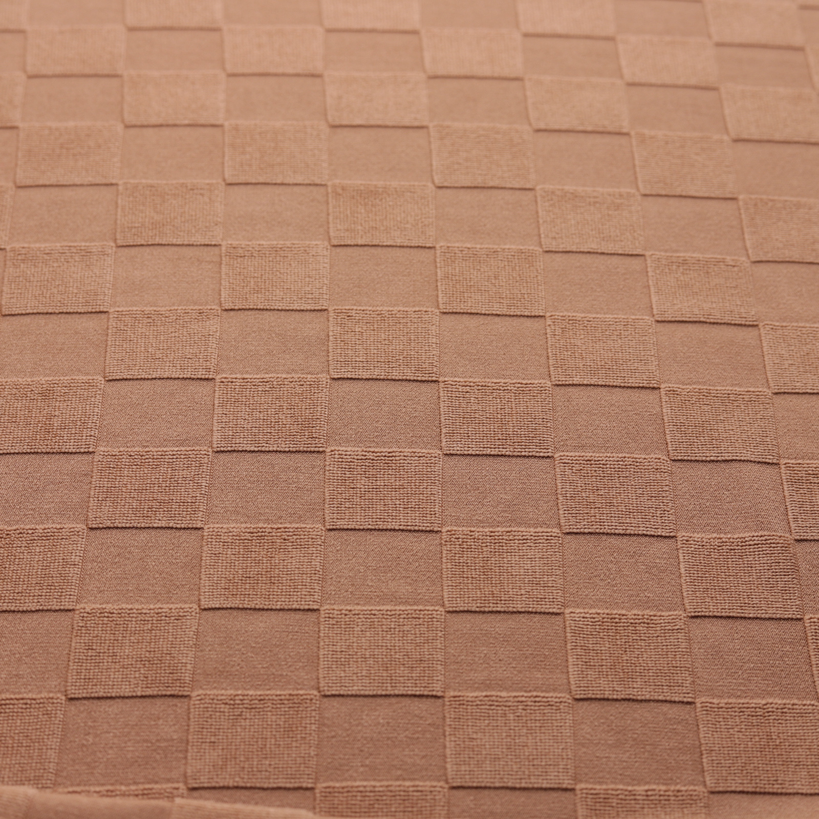 Tecido jacquard liso castanho e texturado com pequenos xadrezes